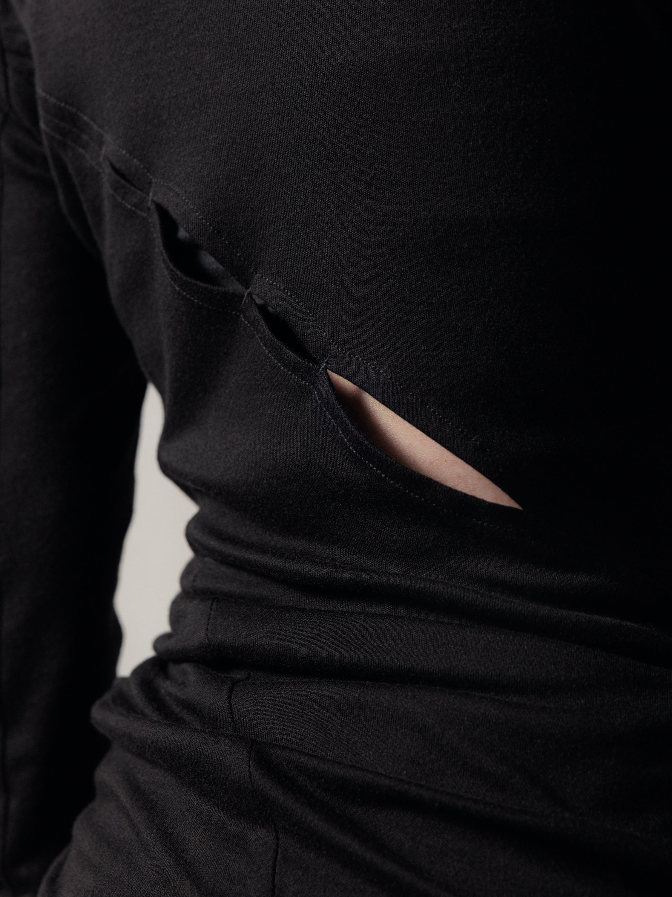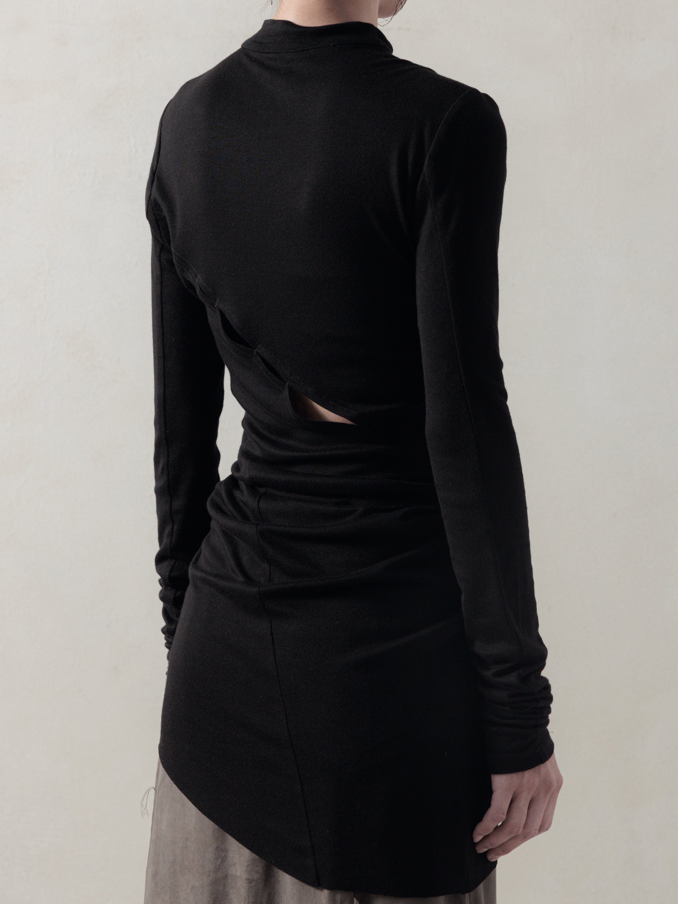 Continuing the brand’s classic design, it uses silky, drapey Tencel knit fabric with a subtle sheen, while drawstrings and irregular cuts create freely adjustable, unrestrained shapes.