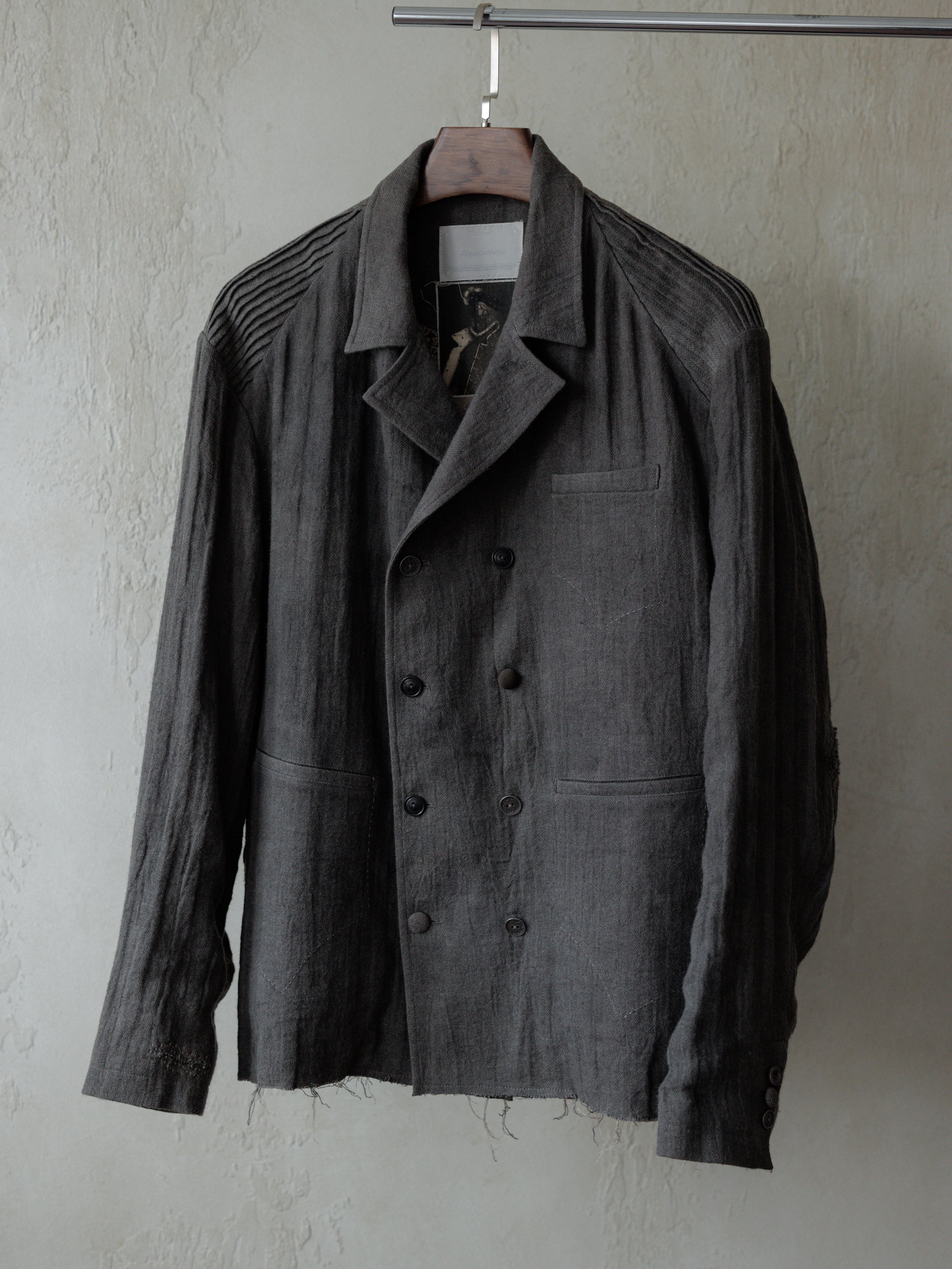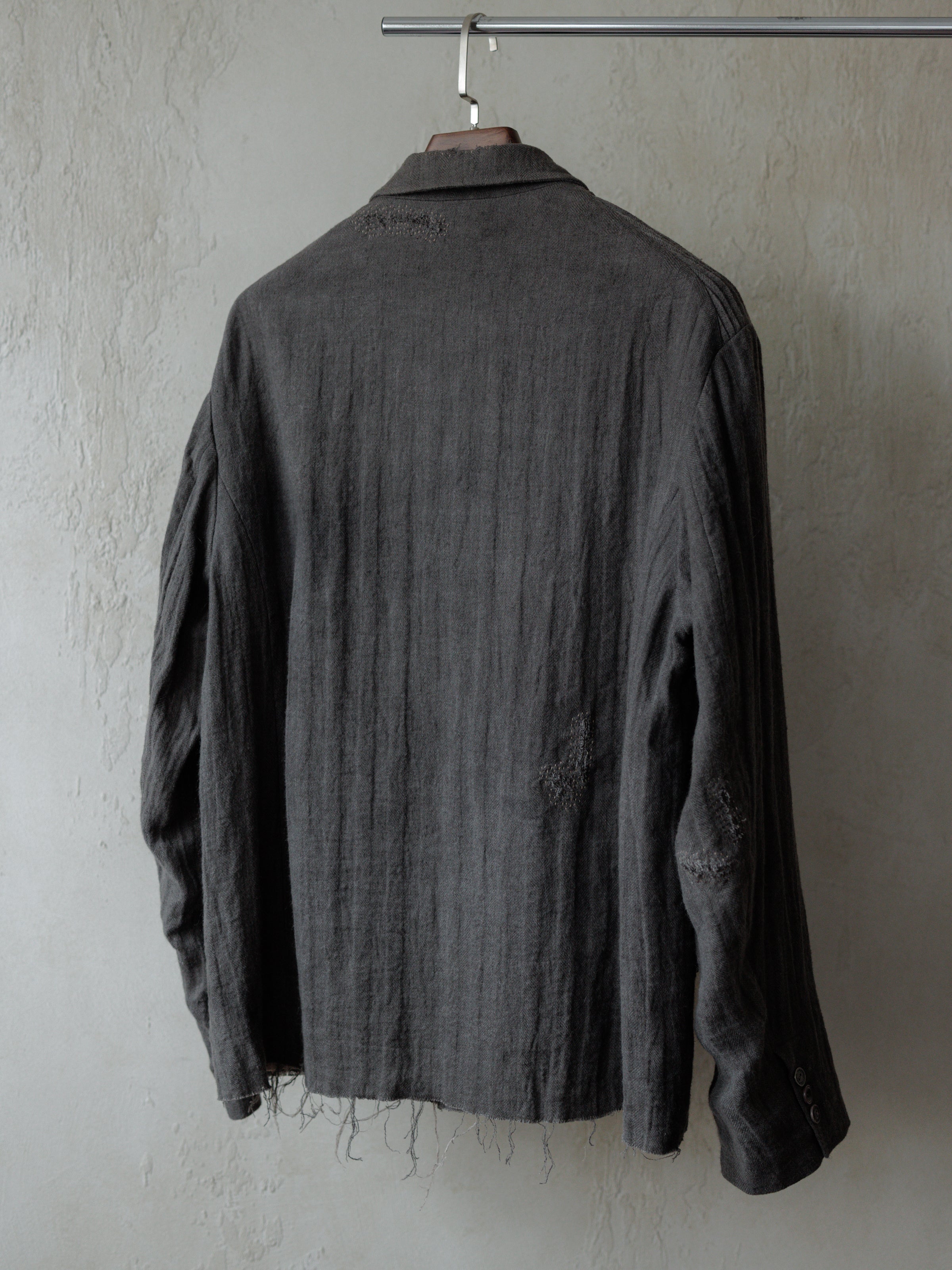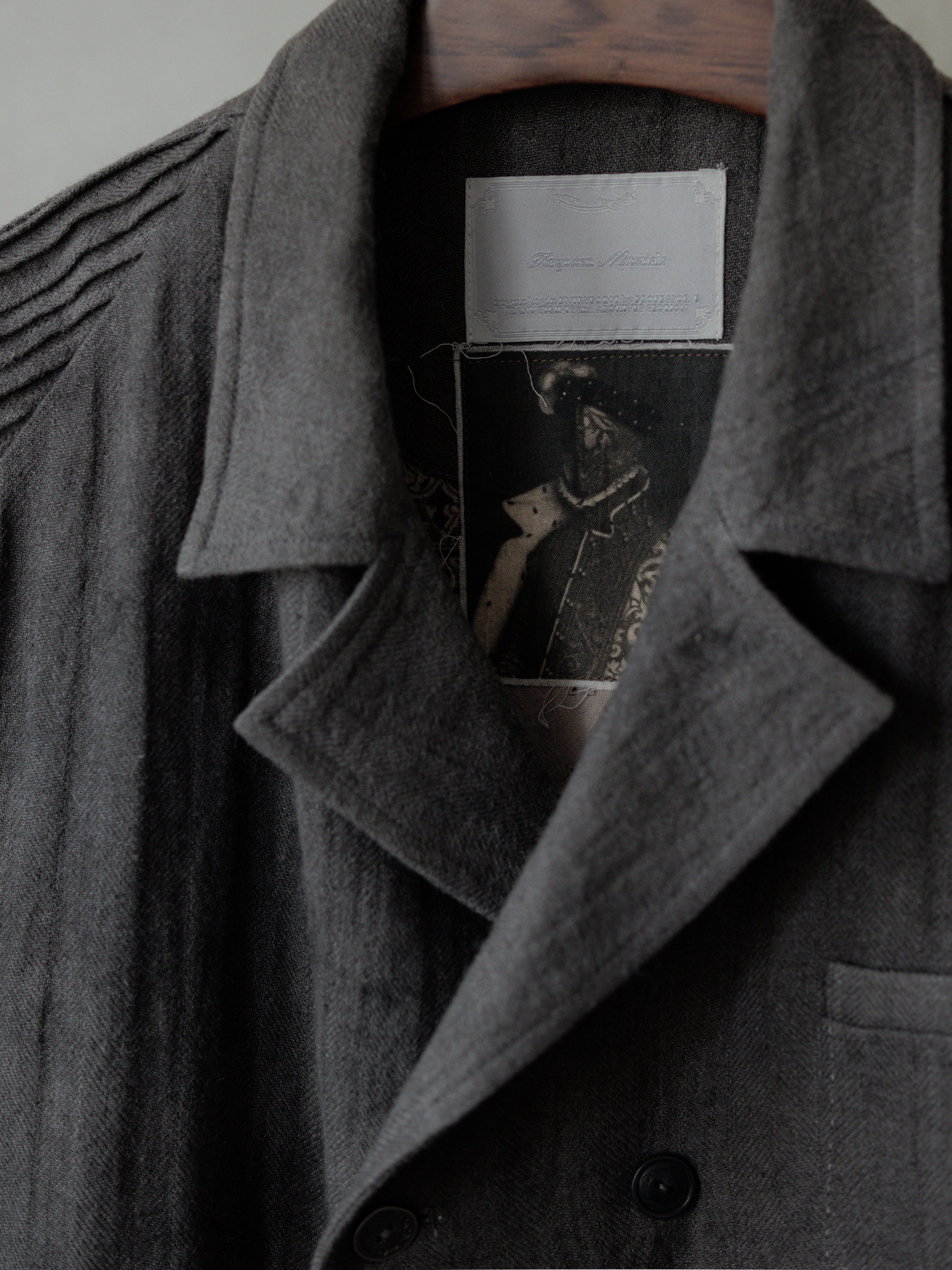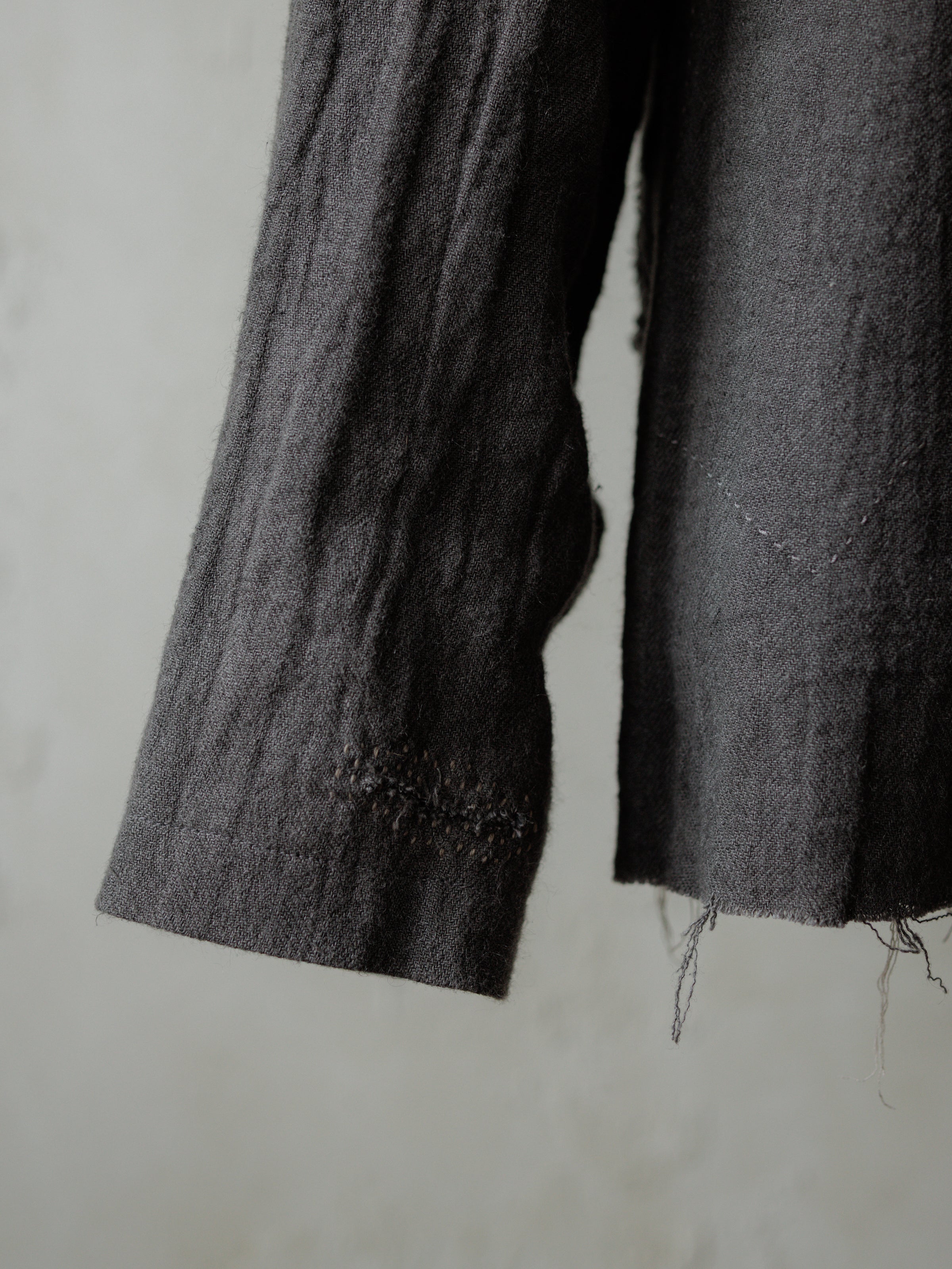 Made with Ramie/Linen blend fabric produced by a Japanese textile mill and dyed with natural plant dyes, the piece embodies Professor.E’s signature preference for muted grey tones.