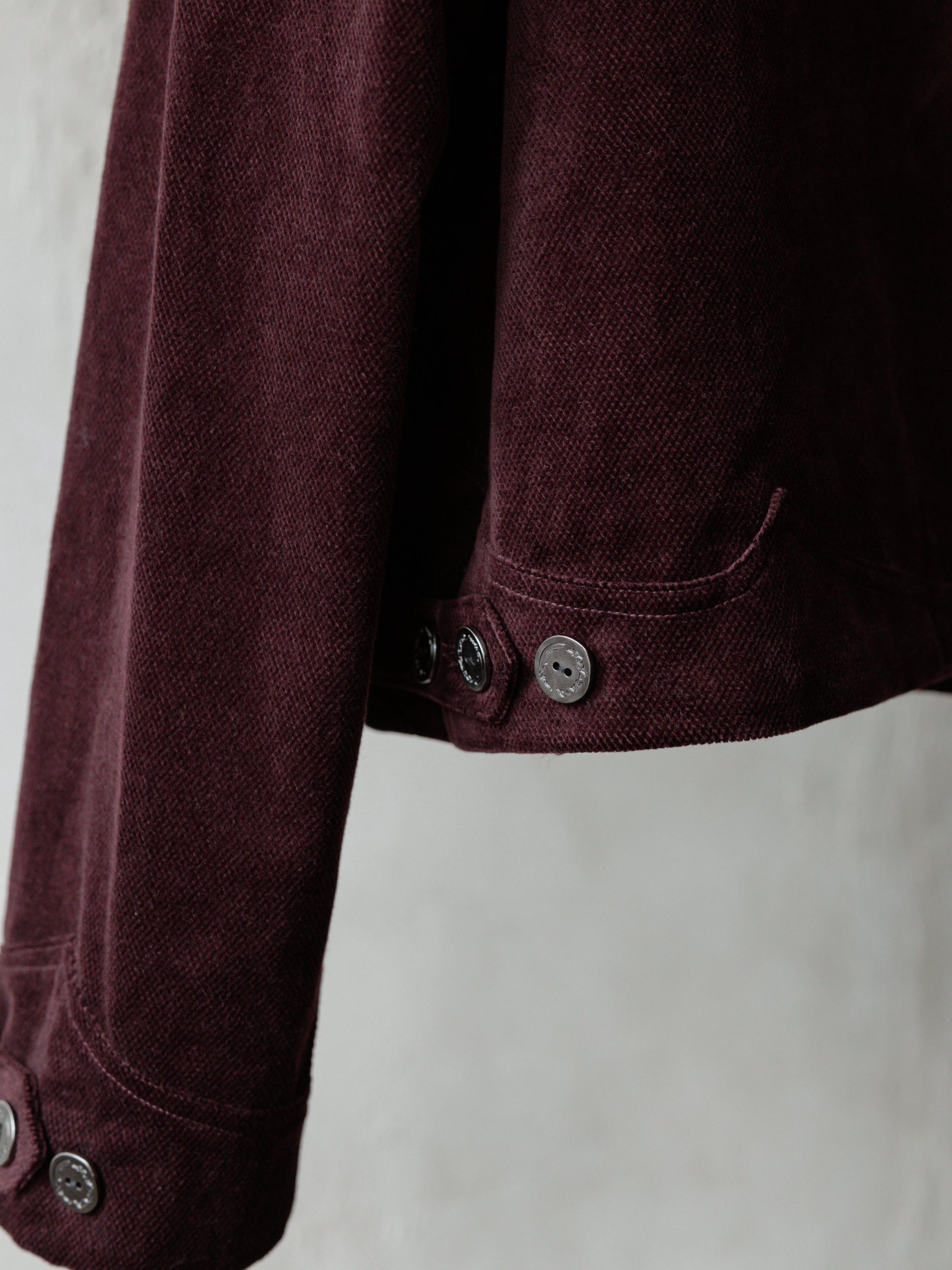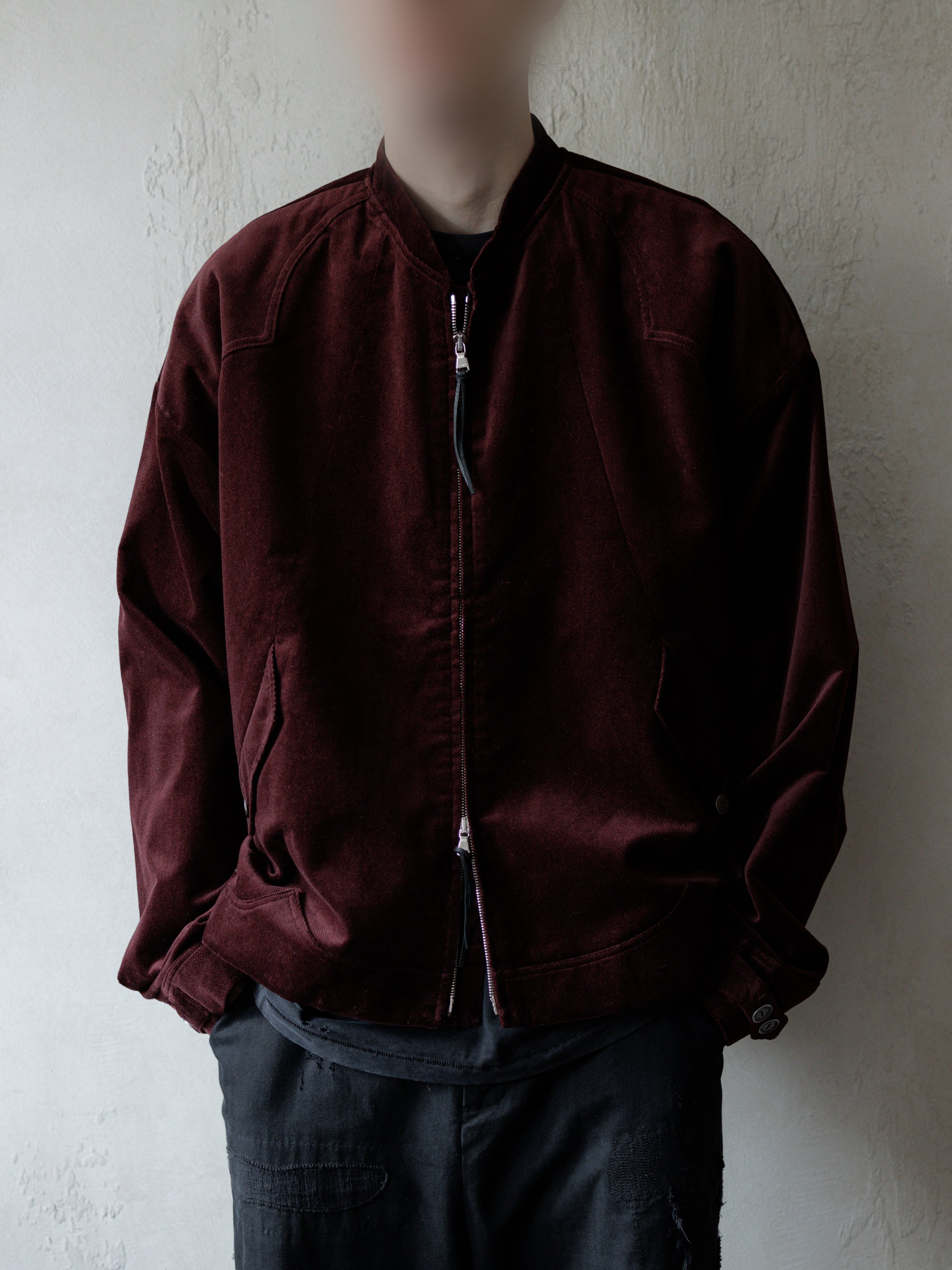 Made from a burgundy velvet fabric blended with cotton and viscose, featuring RIRI zippers and Professor.E’s signature patterned lining.