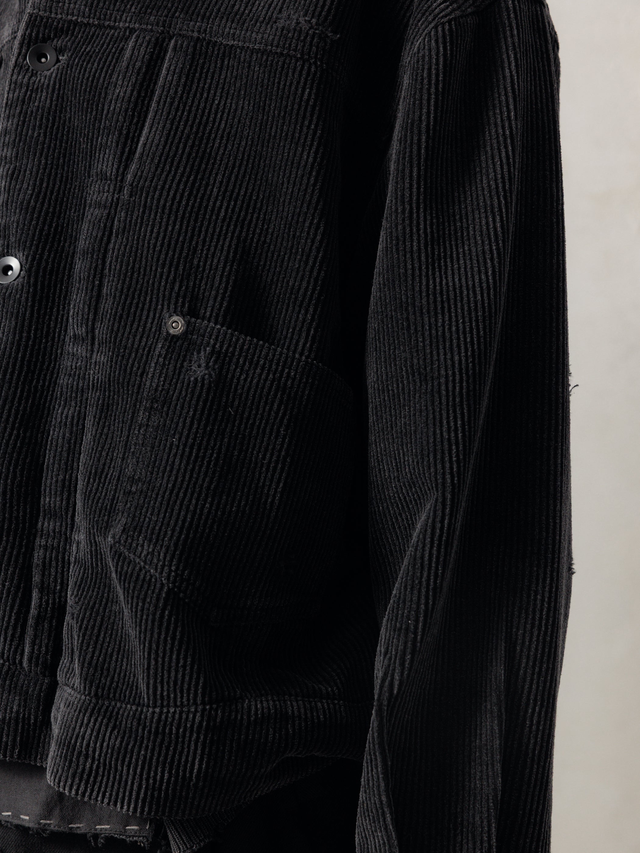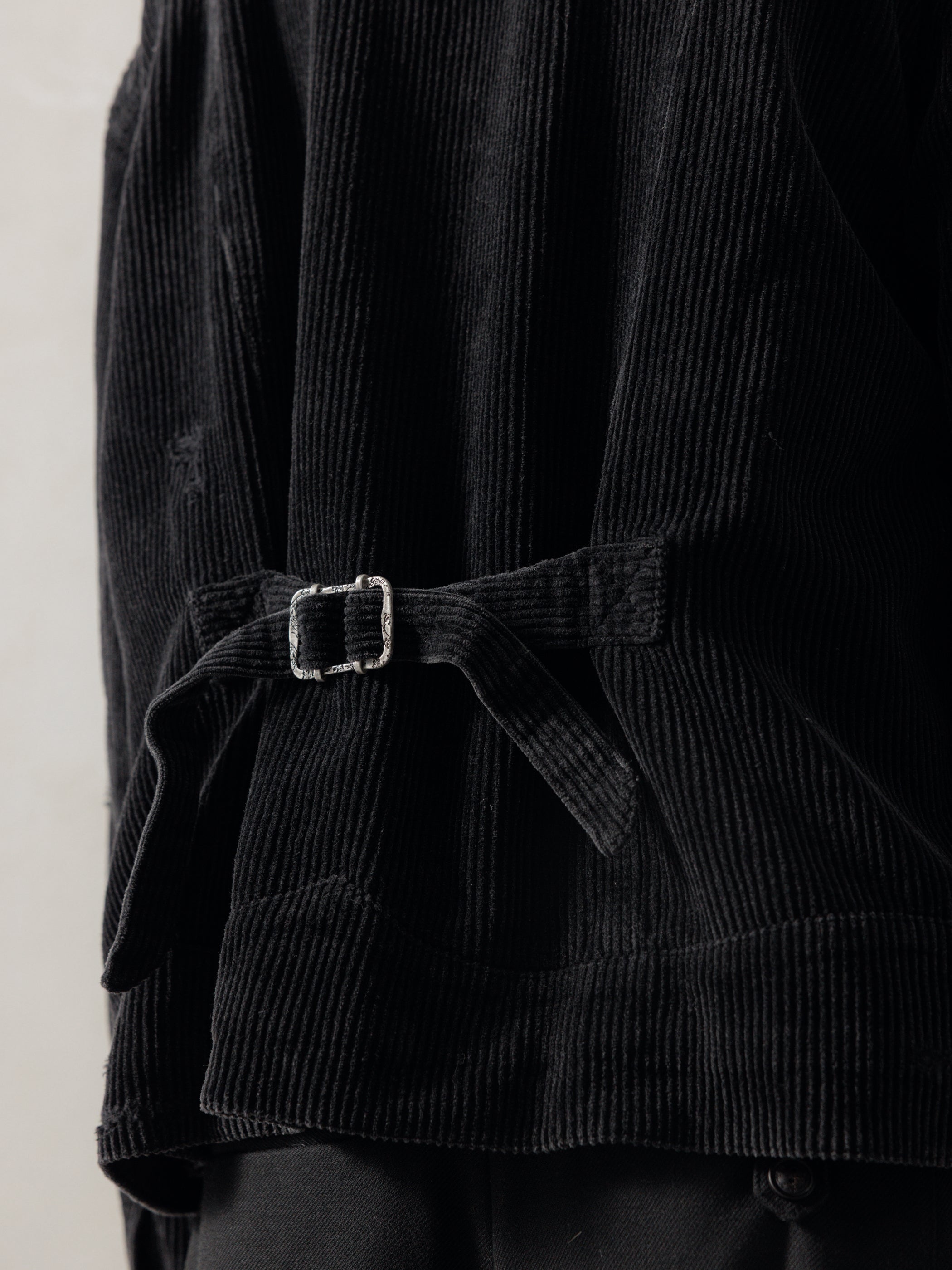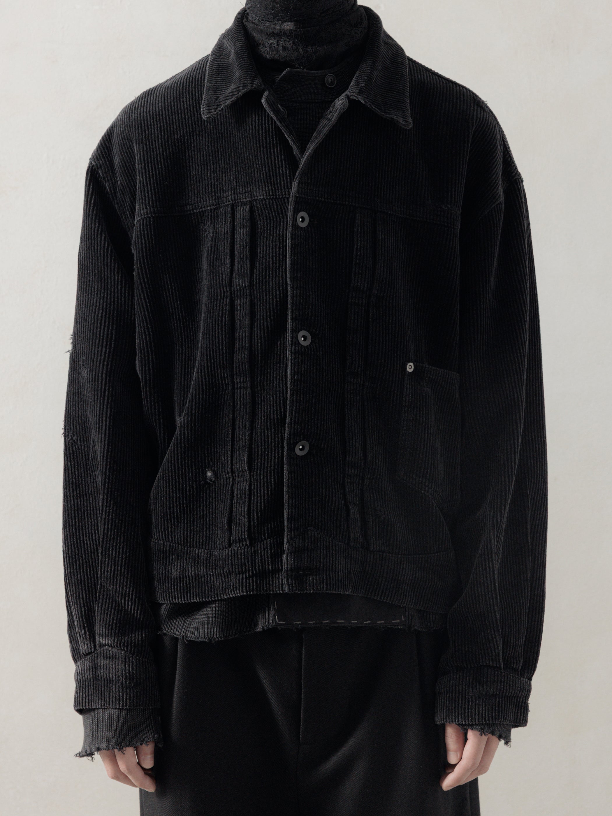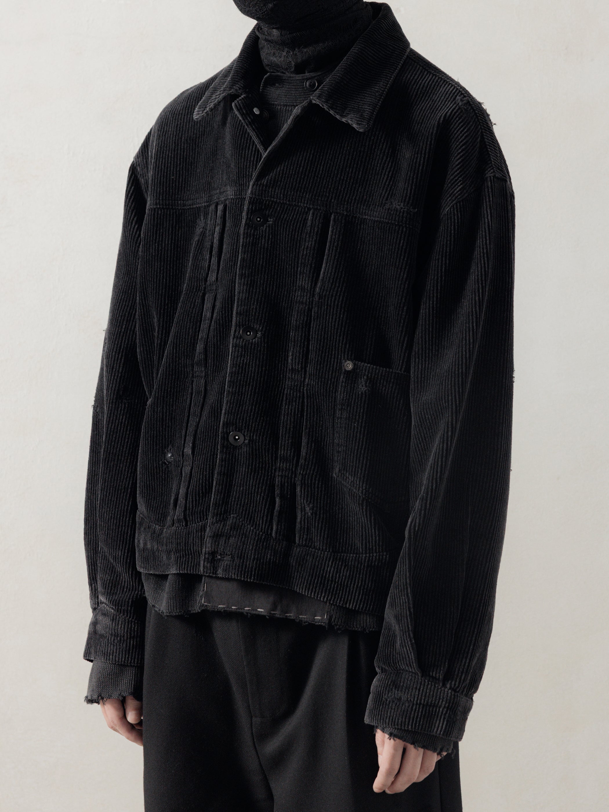 Based on a 1950s American corduroy jacket, the design integrates distressed details and placements with Professor.E’s signature elements, while updating the silhouette into a modern contour.