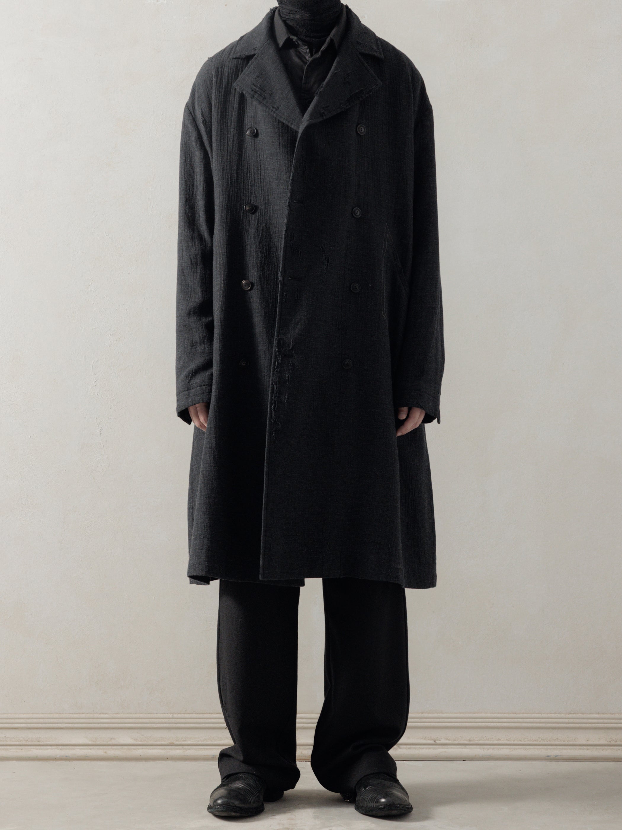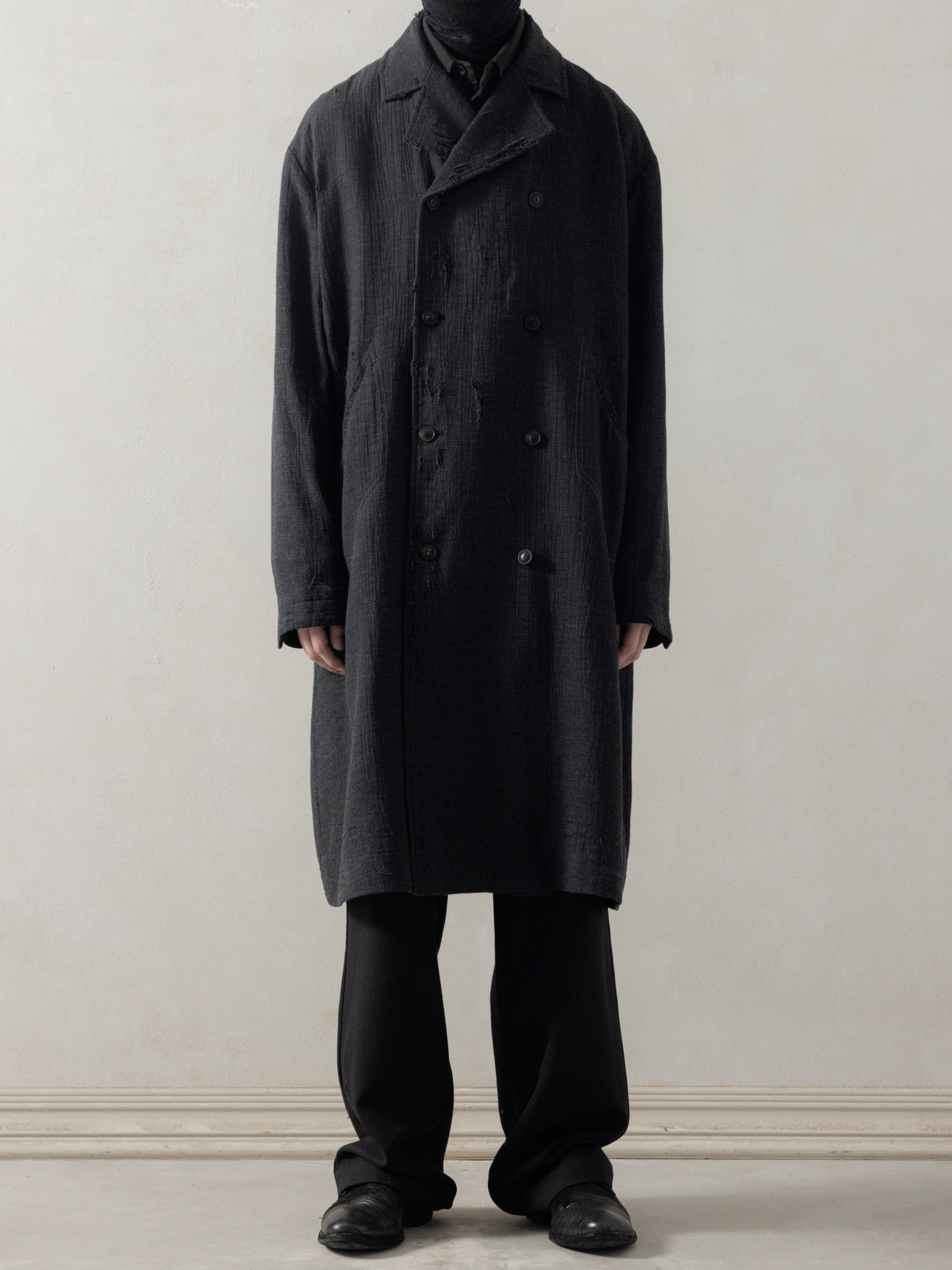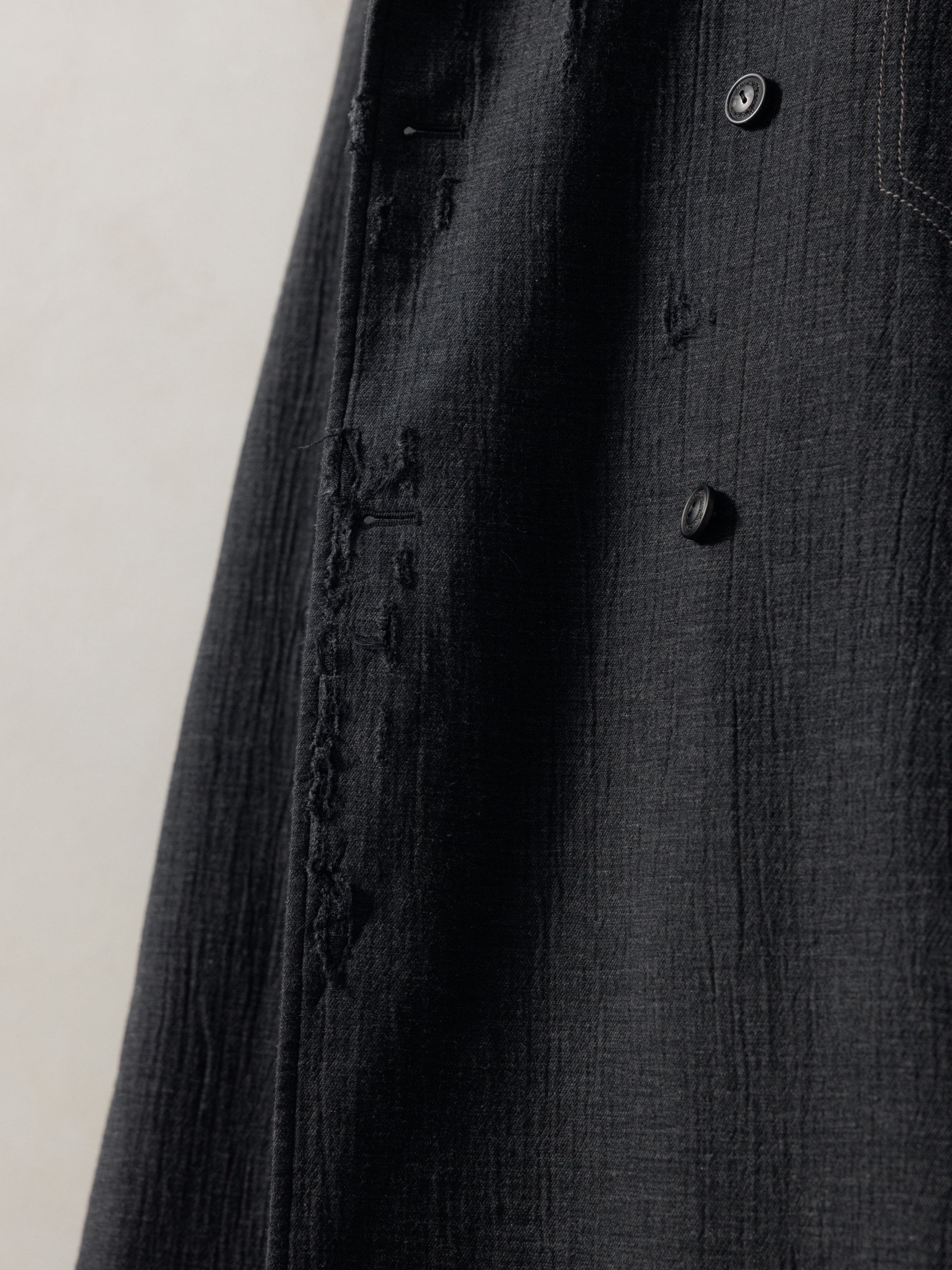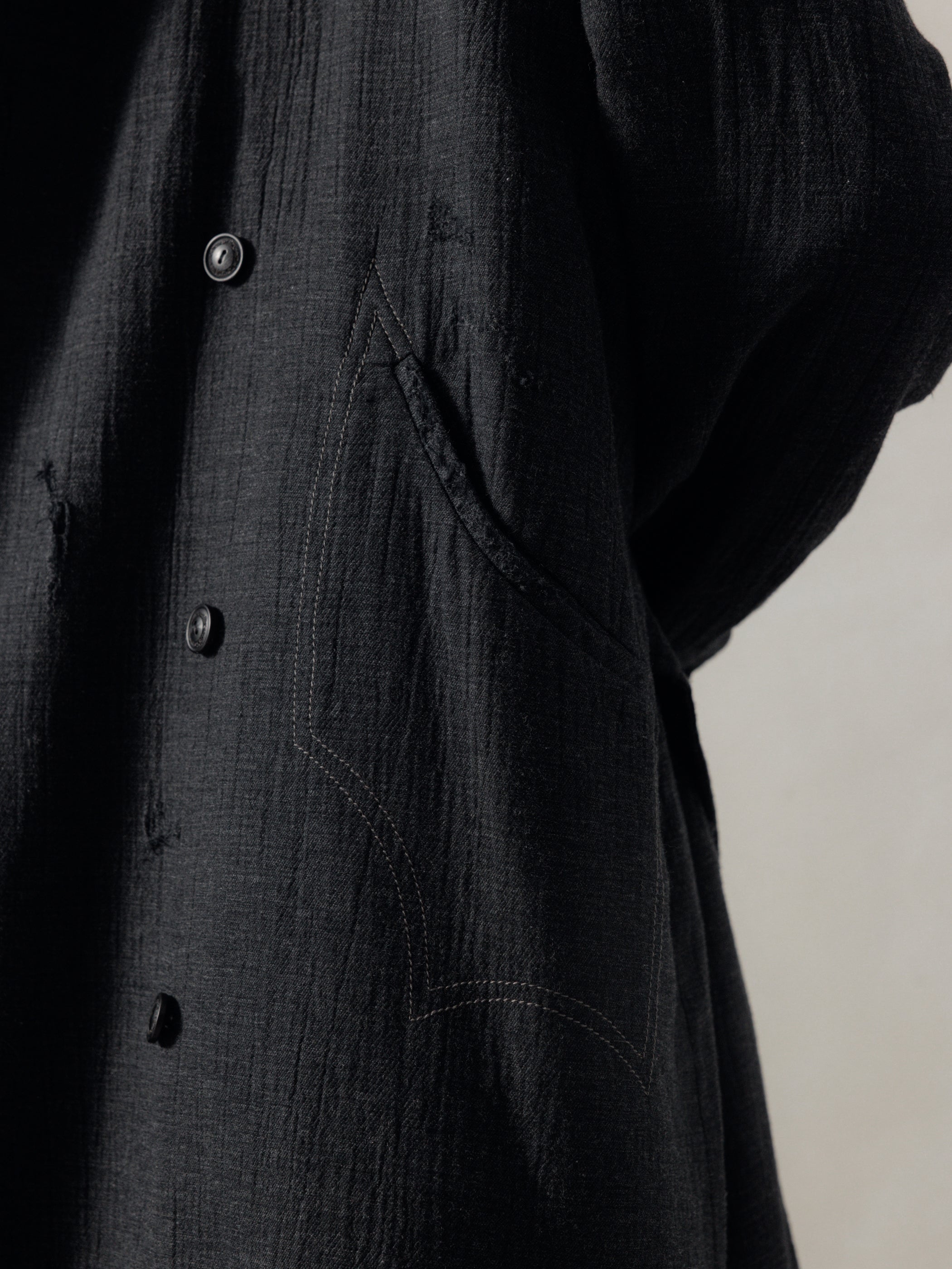 Reference is taken from a French shepherd’s coat from the 1850s collection. Its distressed details are preserved, while the silhouette is adjusted to align with contemporary trends and infused with E’s expressive approach.