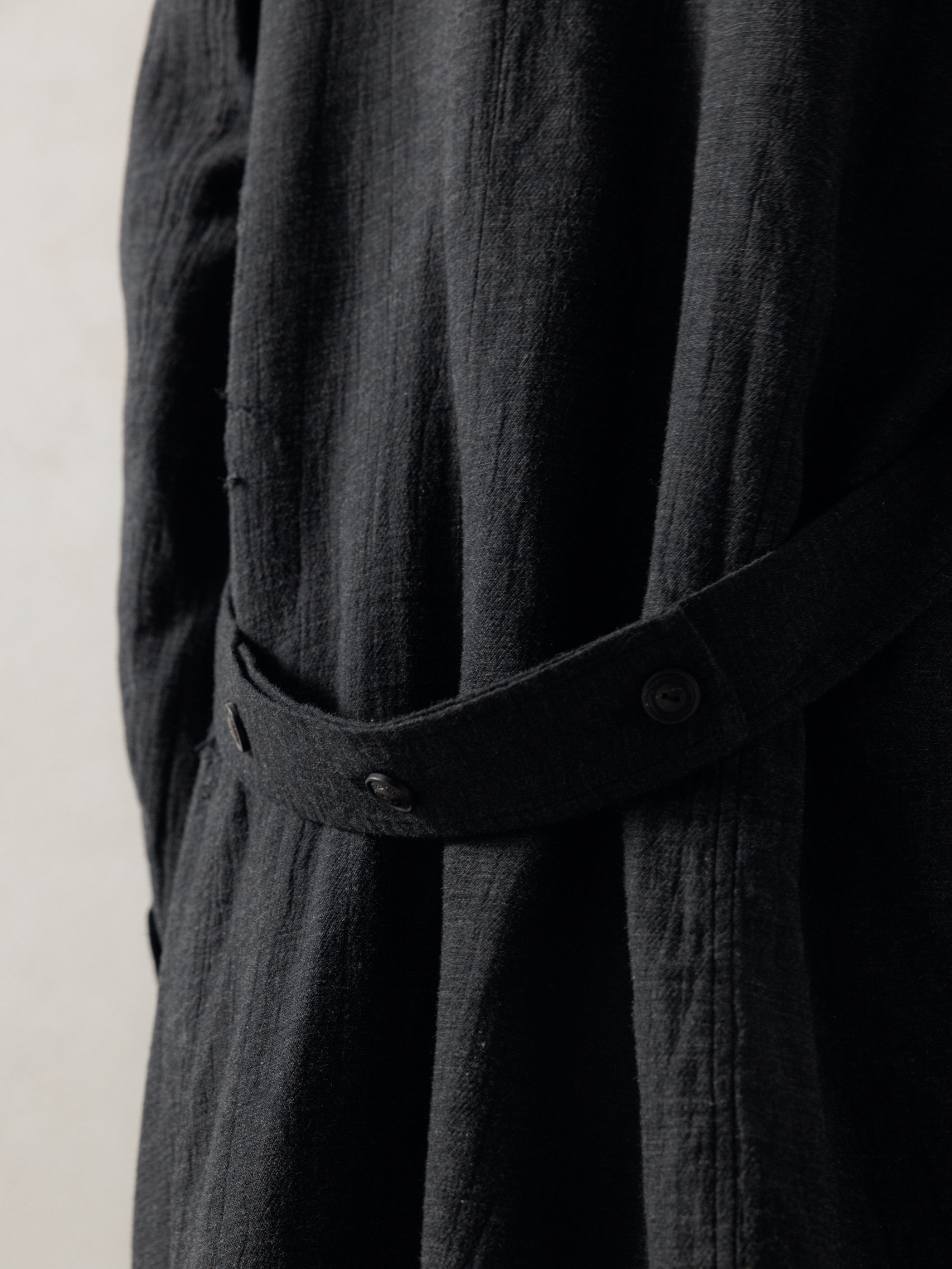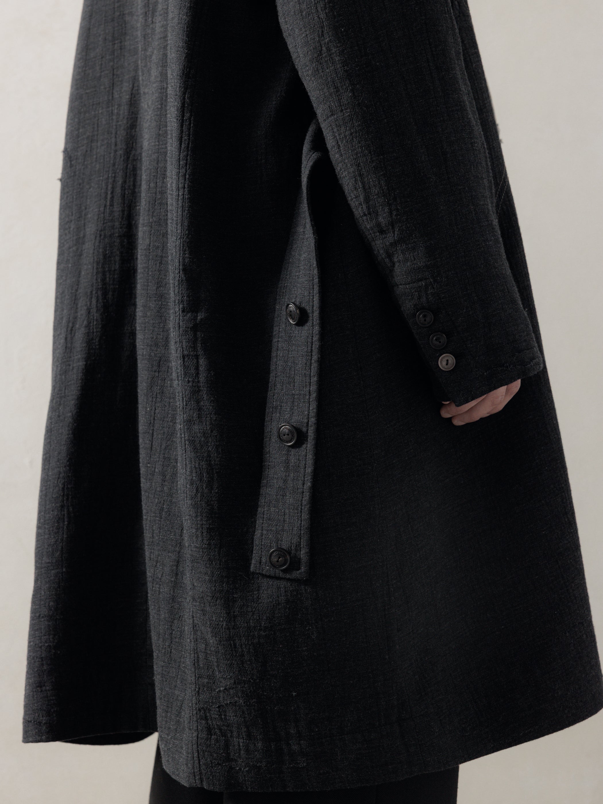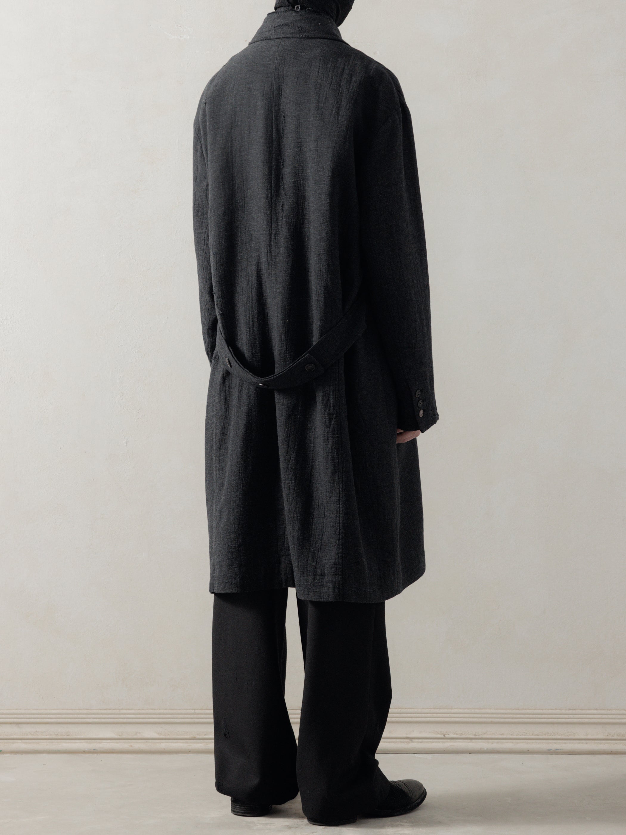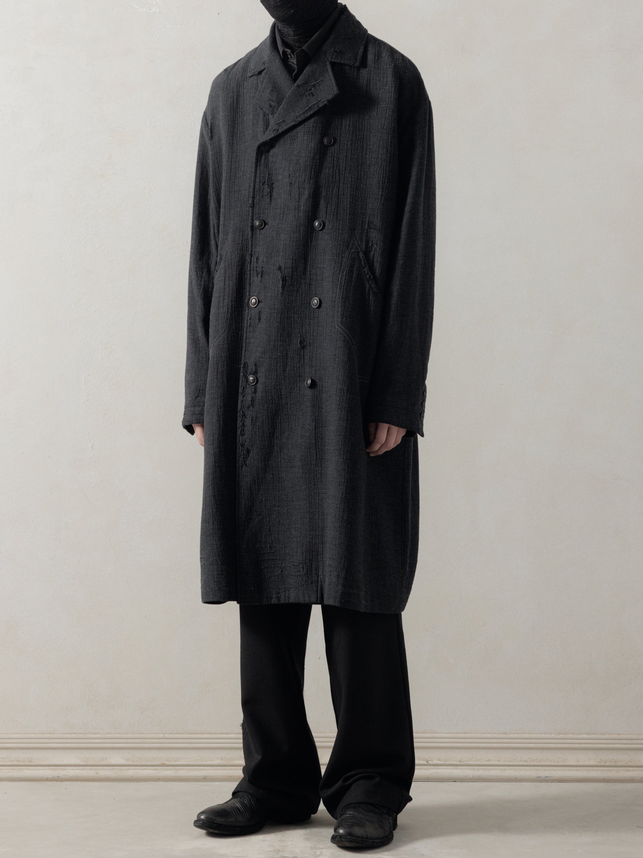 Reference is taken from a French shepherd’s coat from the 1850s collection. Its distressed details are preserved, while the silhouette is adjusted to align with contemporary trends and infused with E’s expressive approach.
