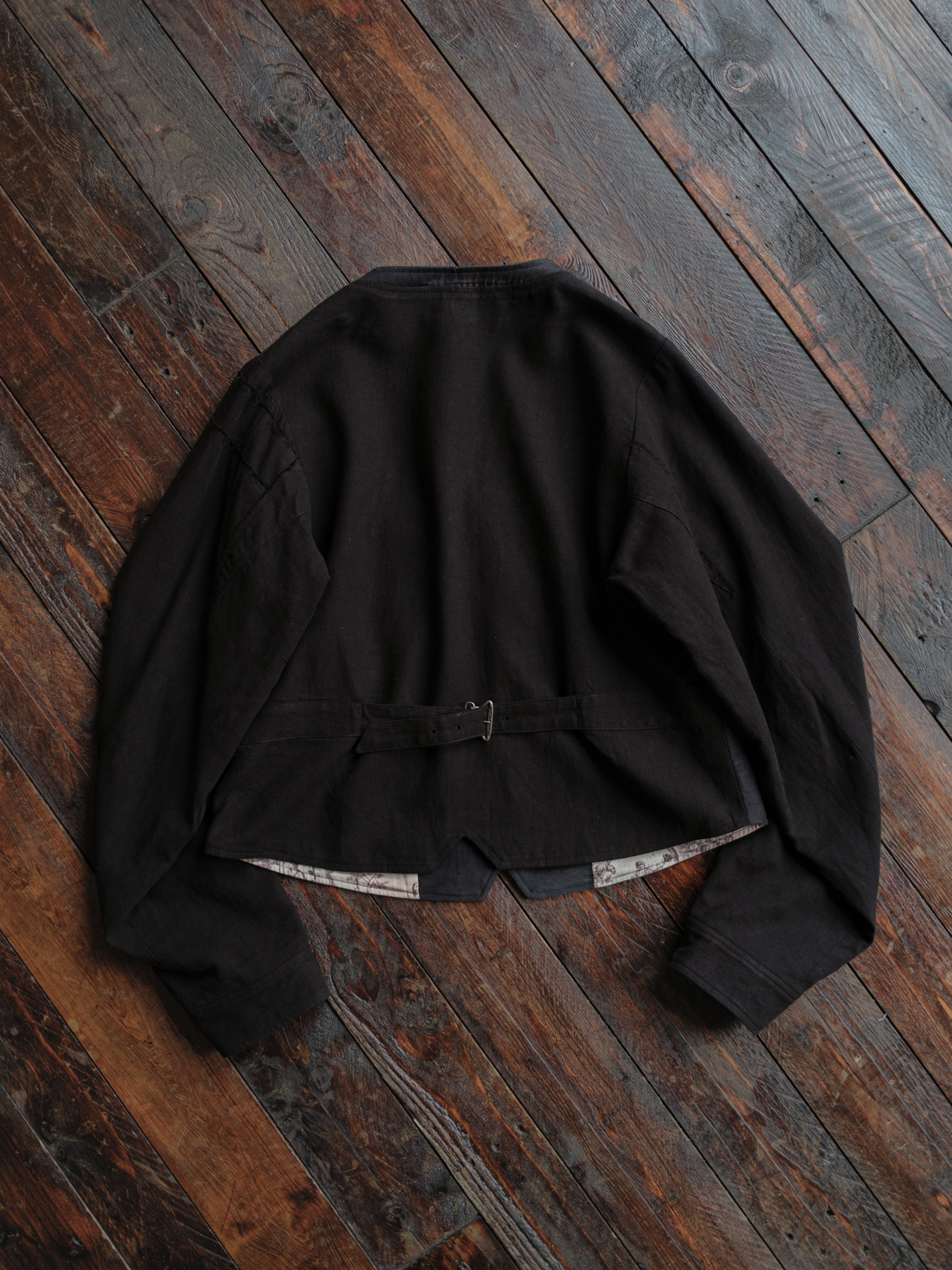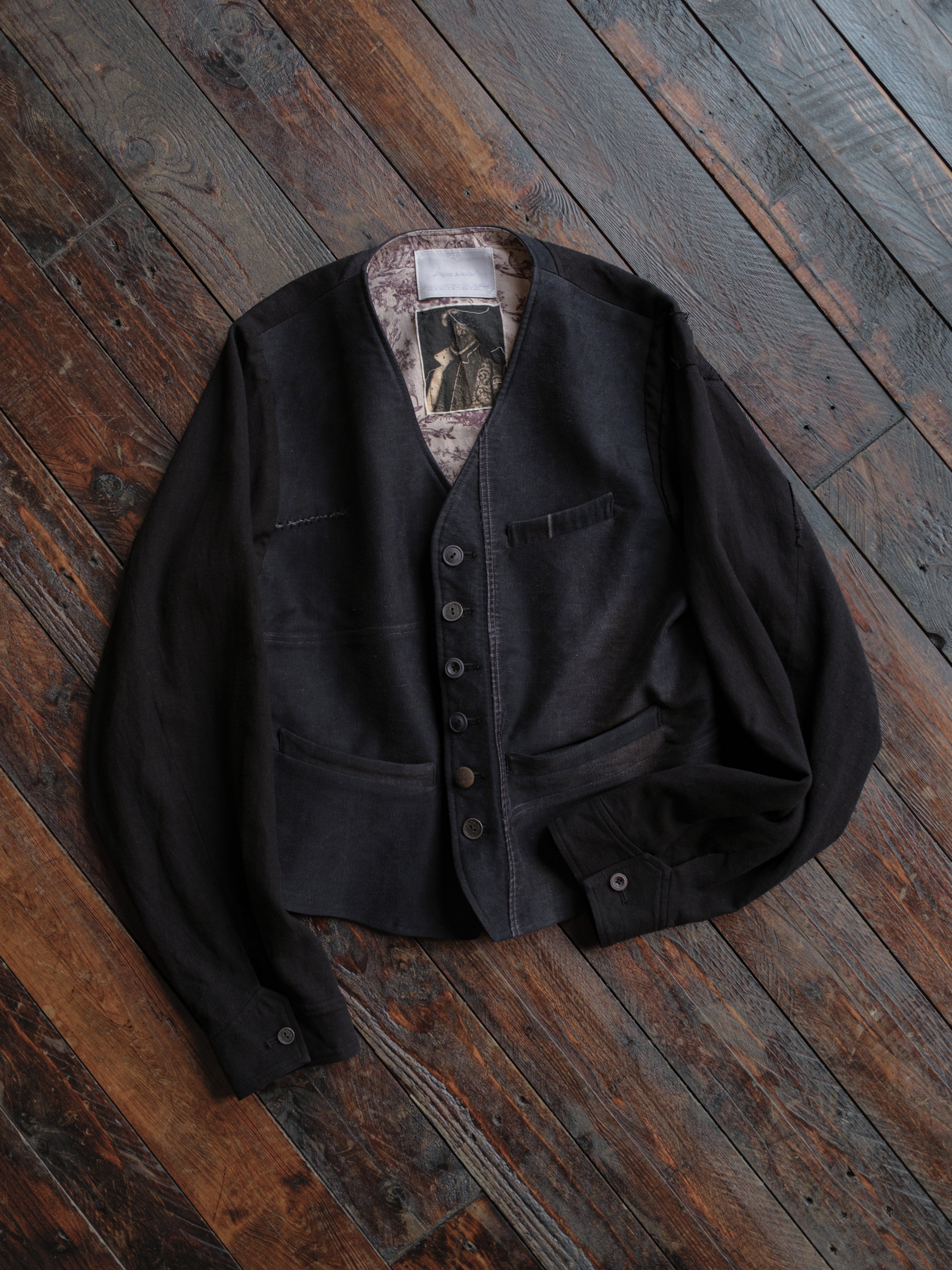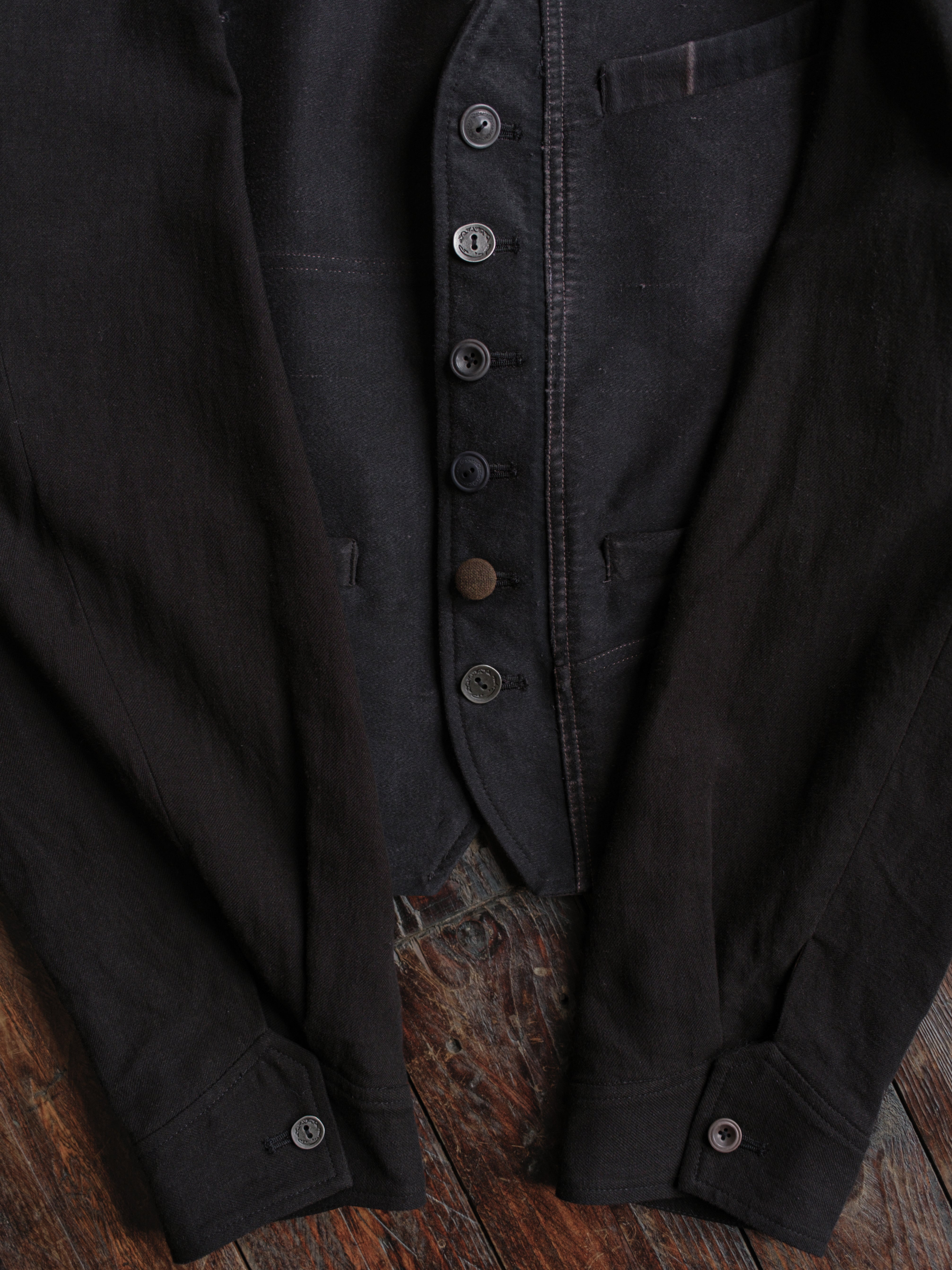 This piece is based on a circa 1930s Farmer Jacket. The original Farmer Jacket evolved from a vest with sleeves added later, which resulted in a very high armhole placement, often causing discomfort and restricted movement when worn.