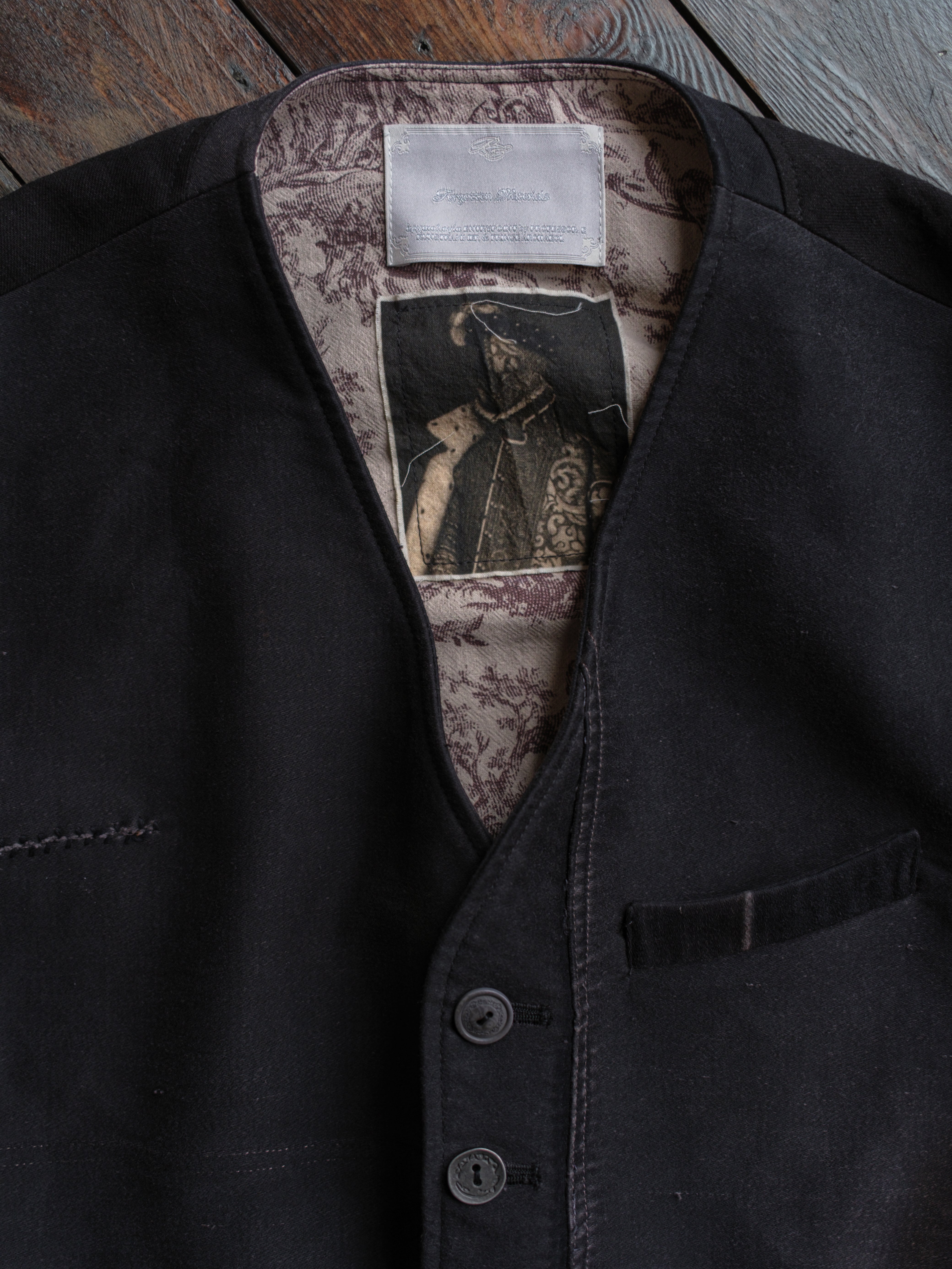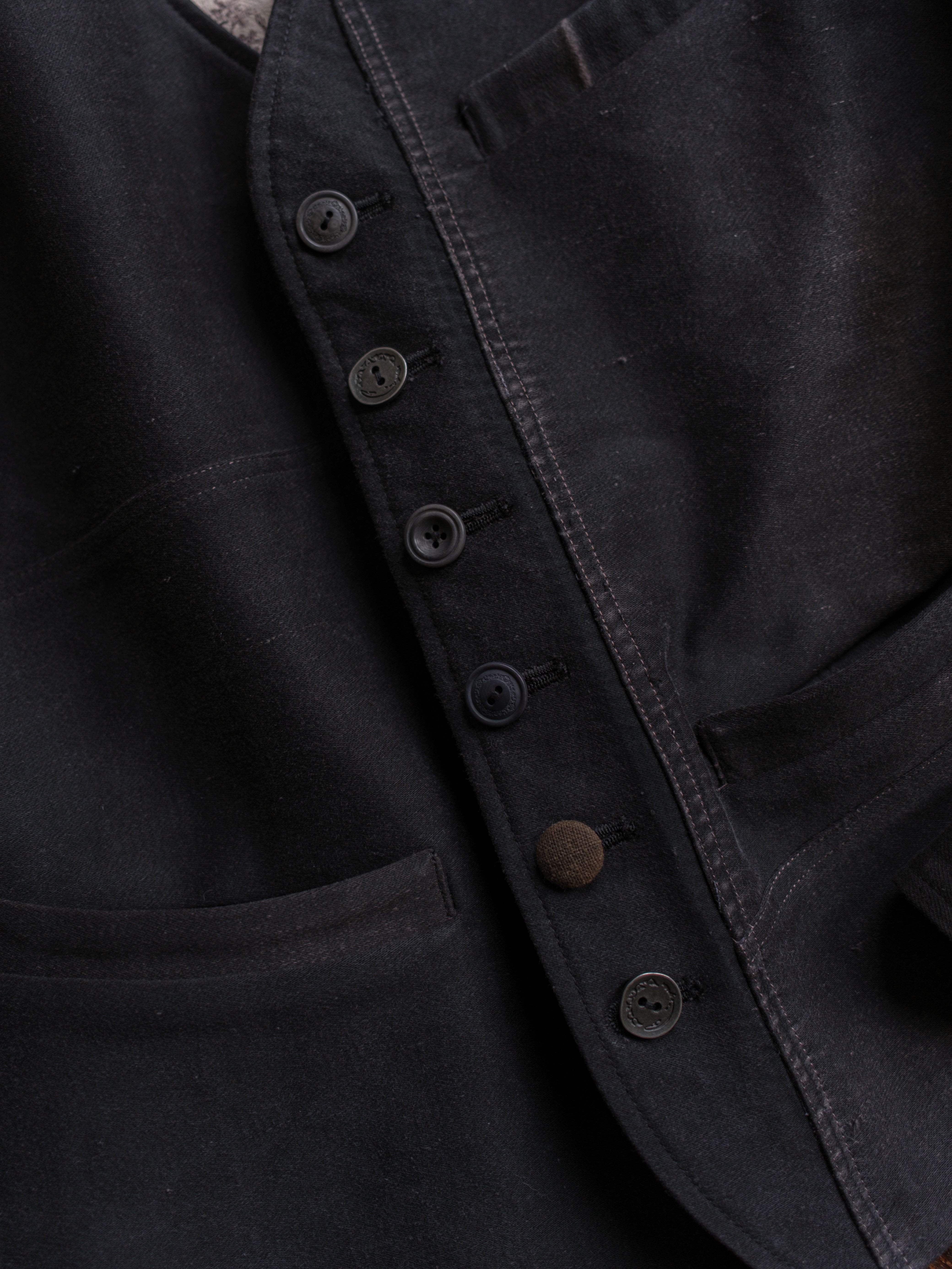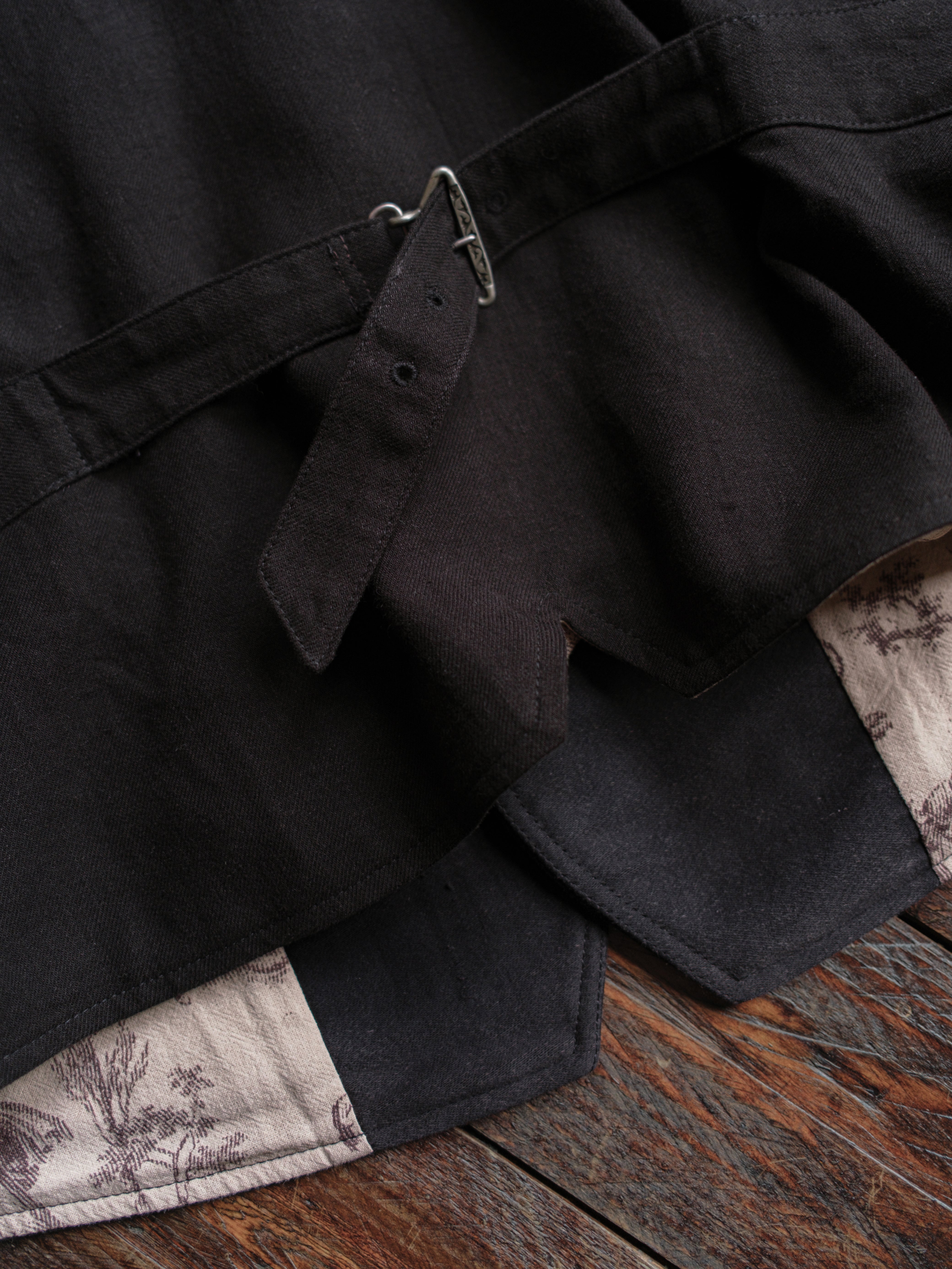 This piece is based on a circa 1930s Farmer Jacket. The original Farmer Jacket evolved from a vest with sleeves added later, which resulted in a very high armhole placement, often causing discomfort and restricted movement when worn.