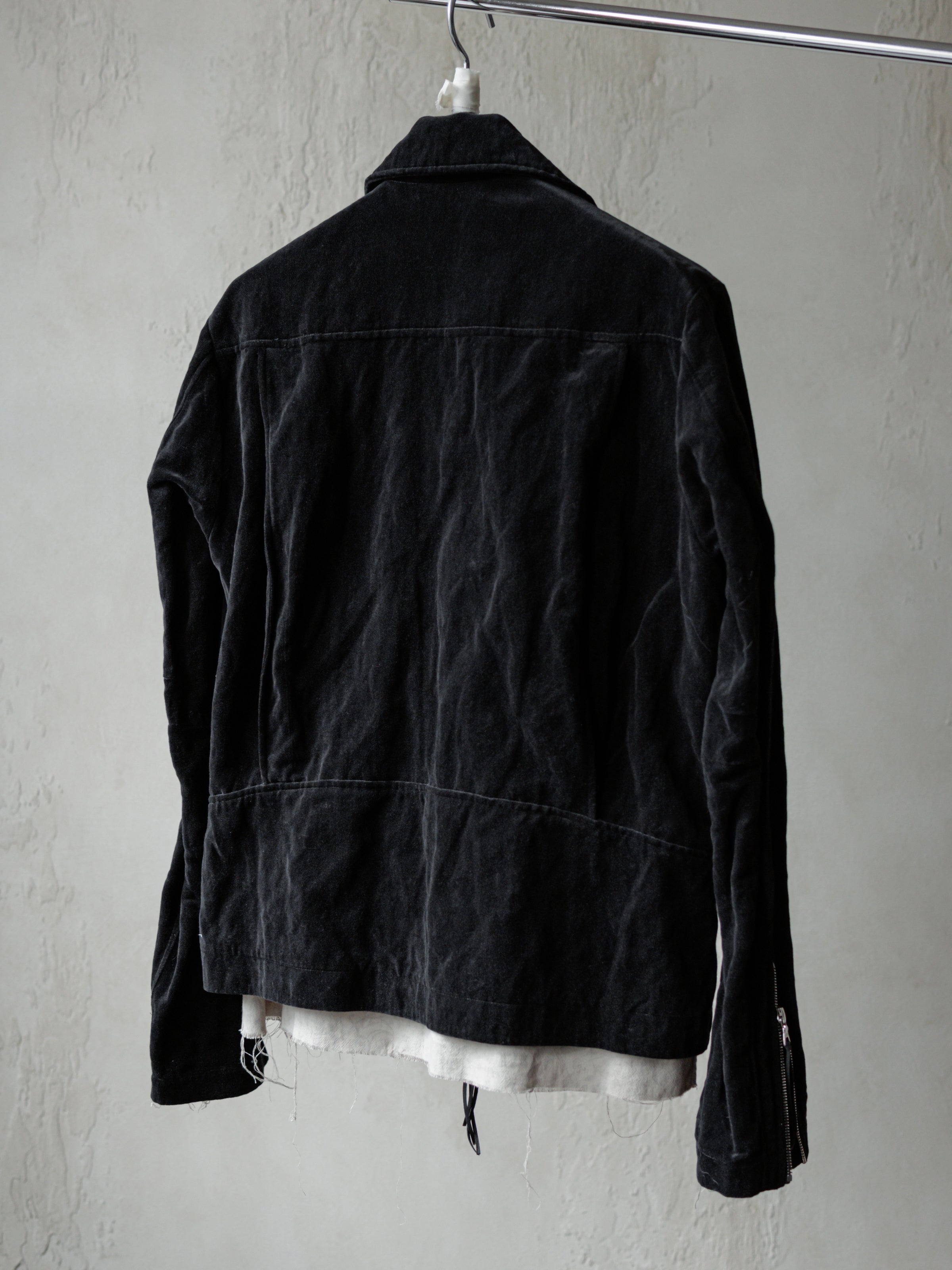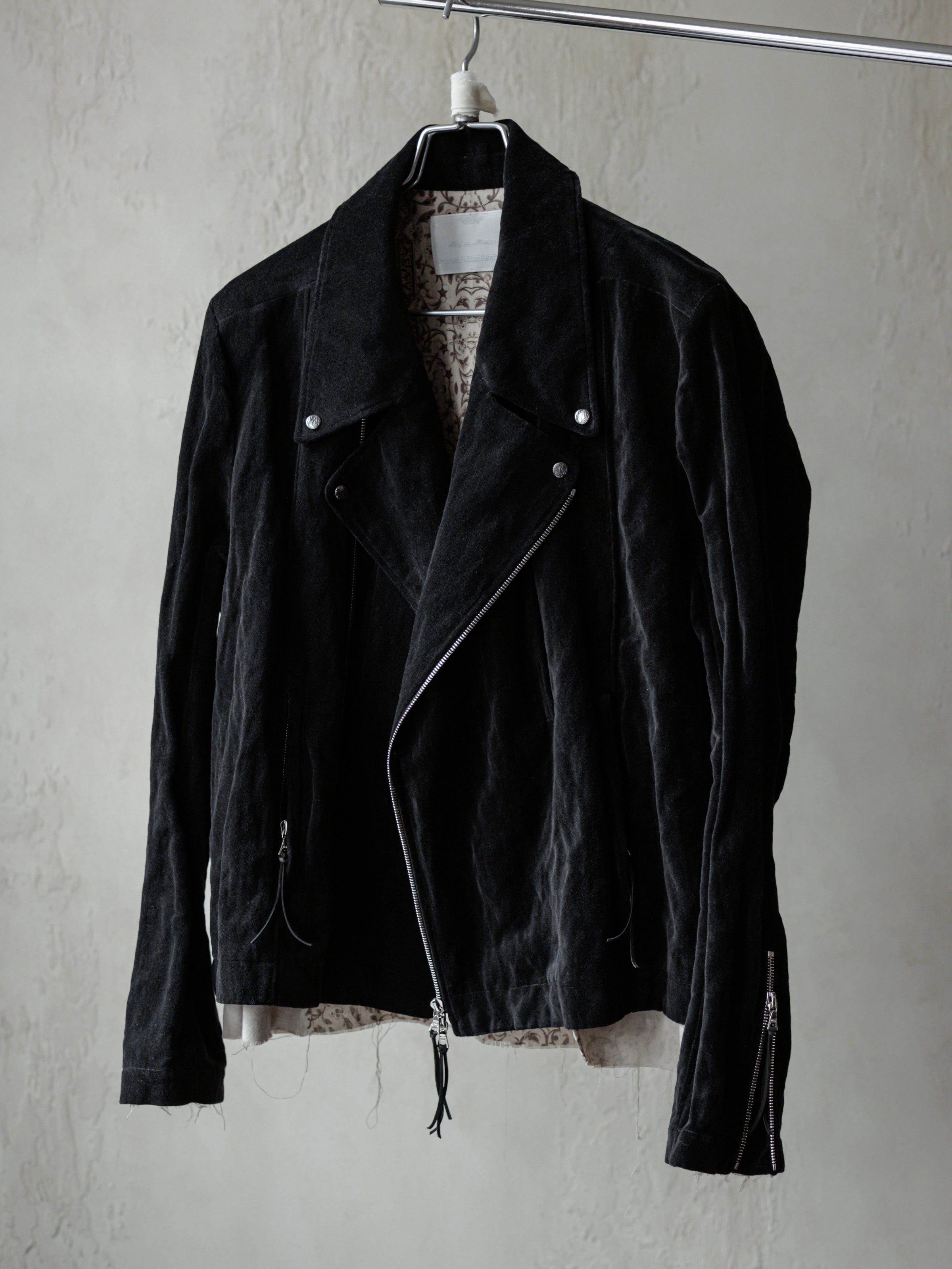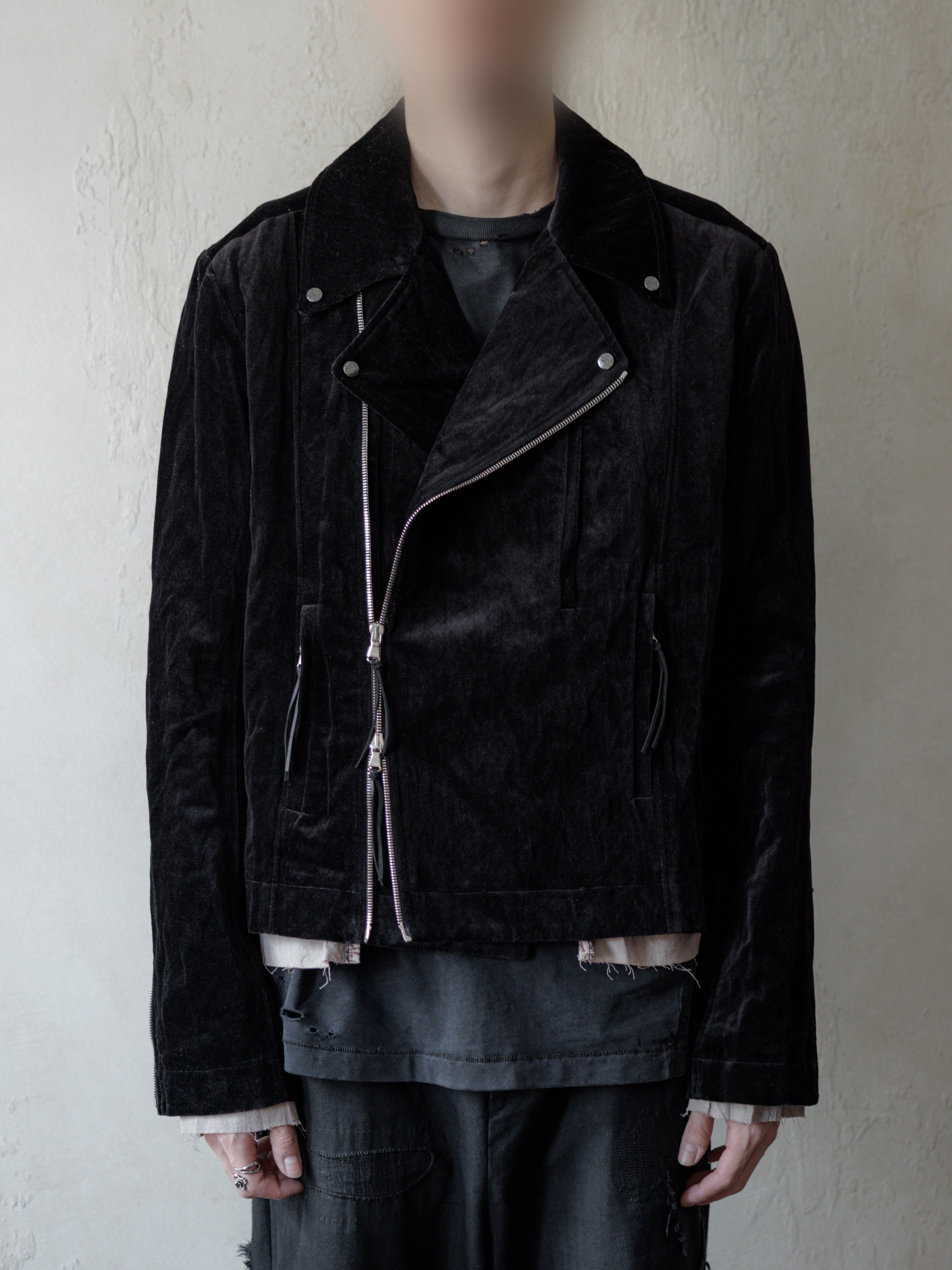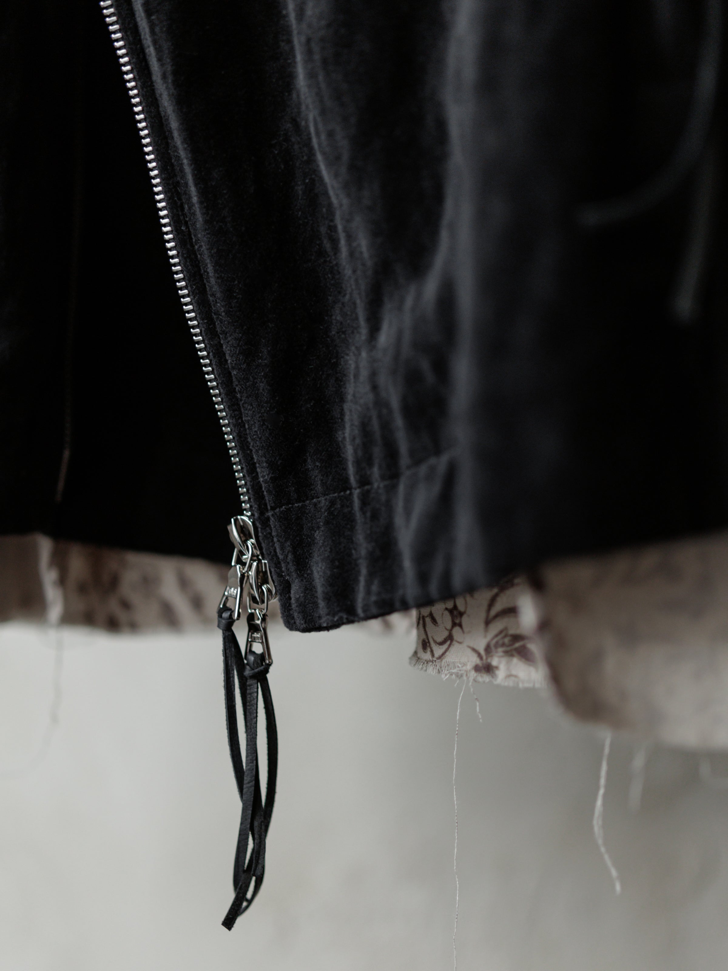 Made from velvet fabric interwoven with metallic threads, naturally forming beautiful wrinkles due to the metal content. Features RIRI zippers and Professor.E’s signature patterned lining.