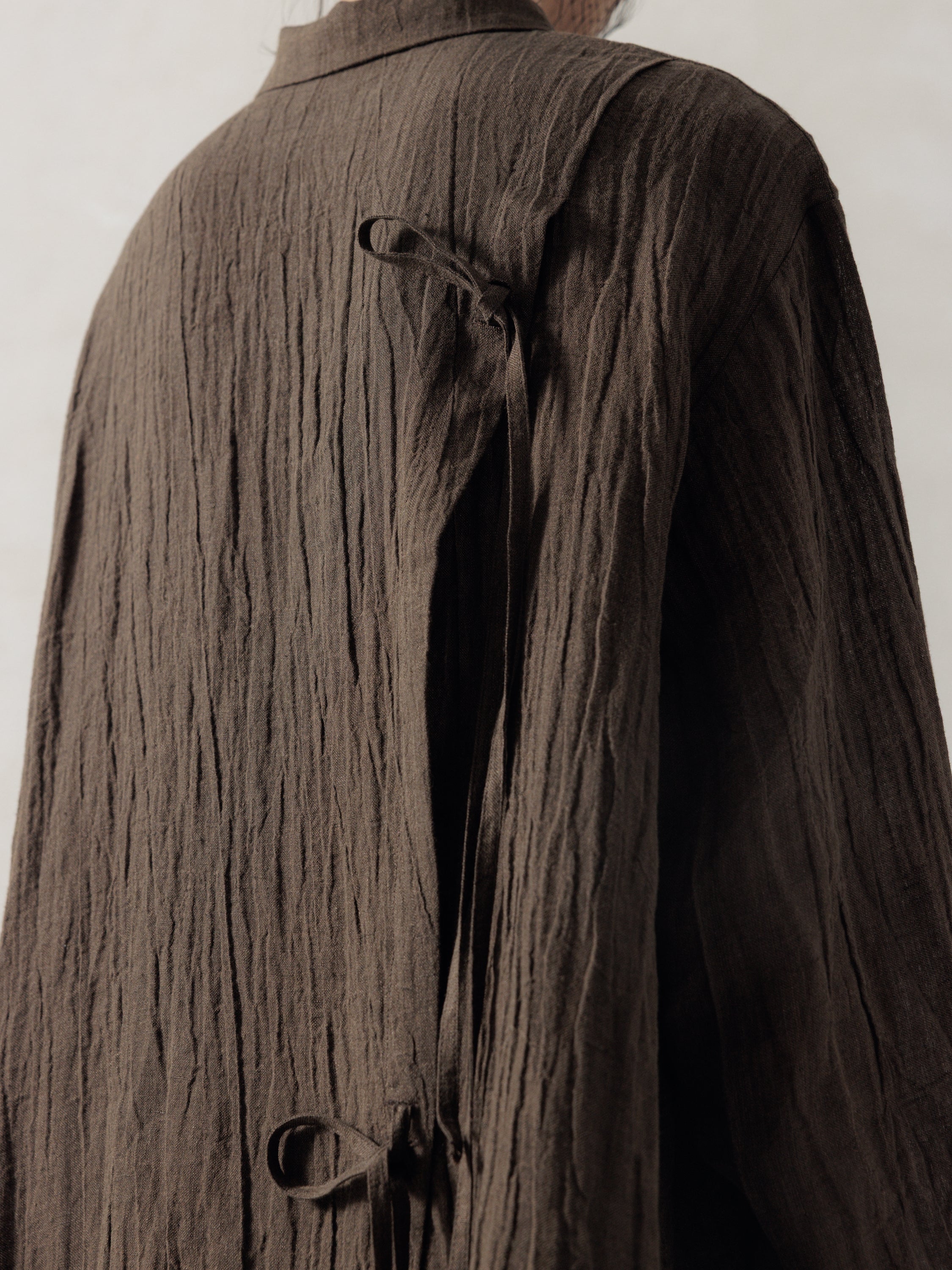 On a minimalist, oversized shirt, textured linen with natural wrinkles creates an interwoven visual effect, while the front placket and back panels feature slits and ties, adding a rhythmic sense to the overall design.